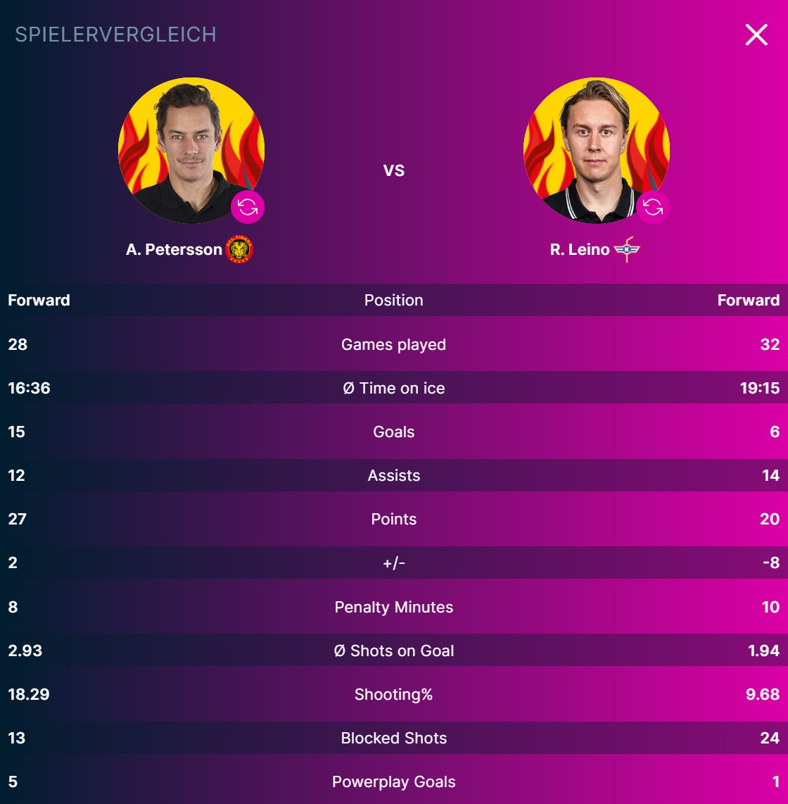 Bei den SCL Tigers trägt André Petersson den gelben Helm. Der Schwede hat bisher 15 Tore erzielt und 12 Assists geliefert. Beim EHC Kloten ist Robert Leino der beste Punktesammler. Der Finne hat sechs Tore und 14 Assists auf dem Konto.