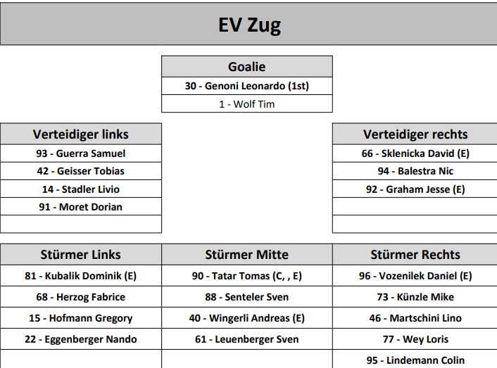 Beim EVZ fehlen Diaz, Schlumpf, Bengtsson und Riva verletzt. Im Vergleich zum 4:0-Sieg gestern gegen Ambri gibt es keine Änderungen. Im Tor steht erneut Leonardo Genoni, der bisher eine Fangquote von 91,57% aufweist.