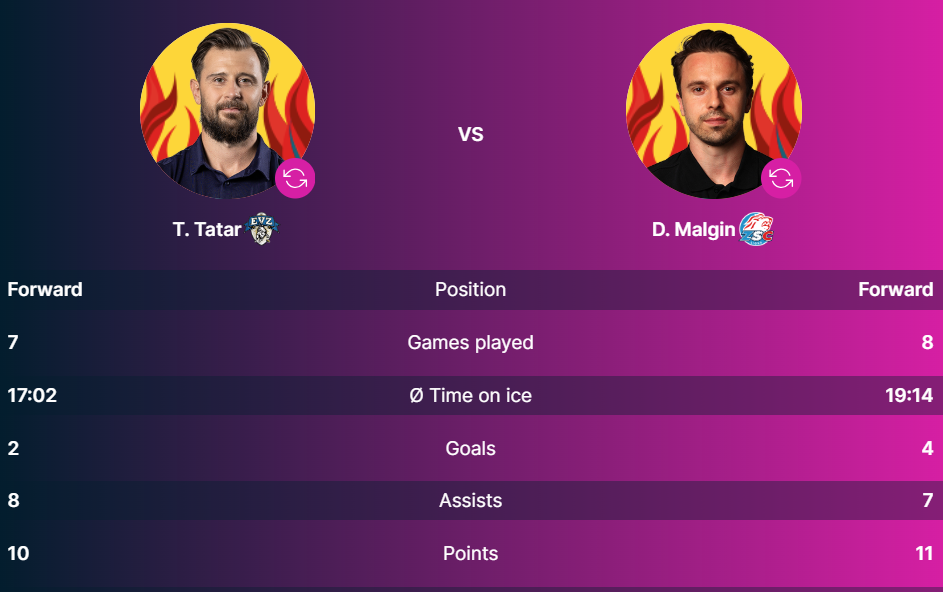 Beim EV Zug trägt Tomas Tatar den gelben Helm. Der tschechische Stürmer hat in dieser Saison in 7 Spielen 10 Punkte gesammelt, darunter 2 Tore und 8 Assists. Auf der Gegenseite ist Denis Malgin der Topscorer der ZSC Lions. In 8 Einsätzen hat er 11 Punkte erzielt, verteilt auf 4 Tore und 7 Assists.