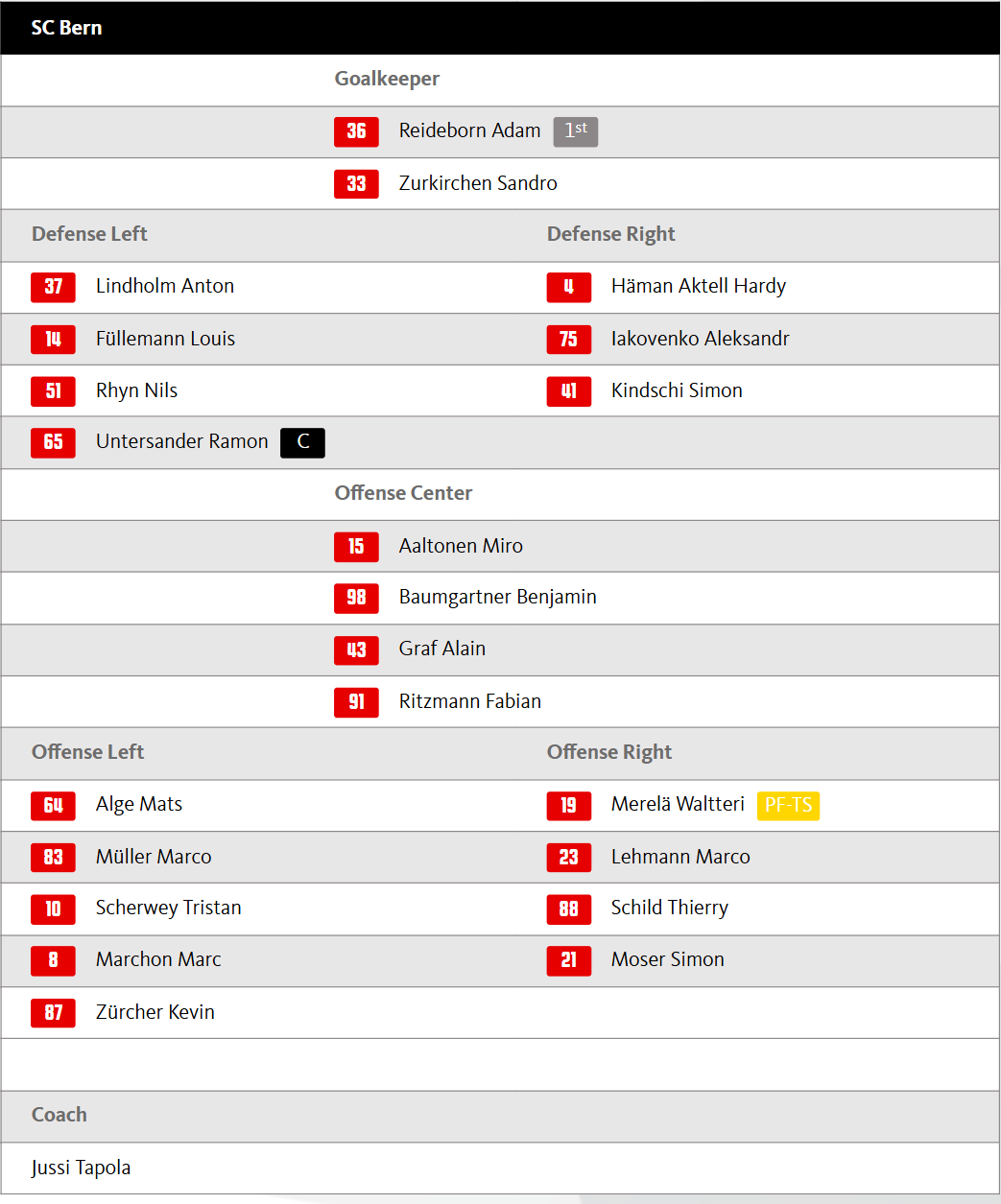 Reideborn ist wieder zurück zwischen den Pfosten beim SC Bern. Häman Aktell rutscht für Iakovenko neben Lindholm in den ersten Defensivblock. Die erste Linie bilden Alge, Aaltonen und Merelä. Bemström und Vermin werden als überzählig gemeldet.