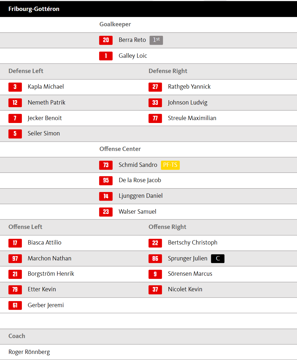 Bei Gottéron gibt es keinen Grund für Veränderungen. Berra steht im Tor und Kapla sowie Rathgeb bleiben in der ersten Defensivreihe. Die Offensive bilden Biasca, Schmid und Bertschy - das Trio konnte schon 26 Scorerpunkte in dieser Spielzeit verbuchen. Rod und Dorthe sind überzählig.