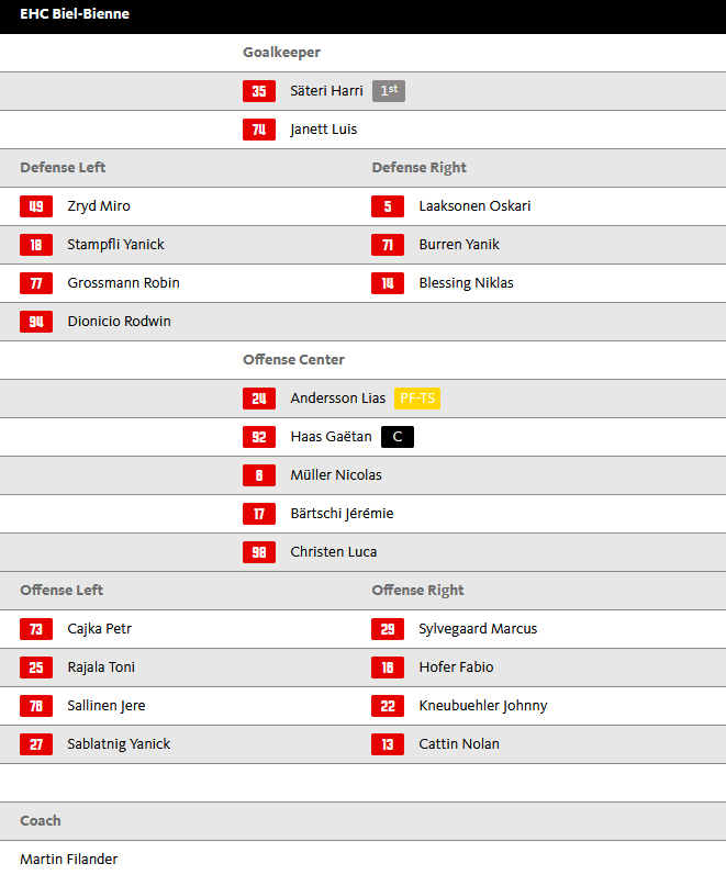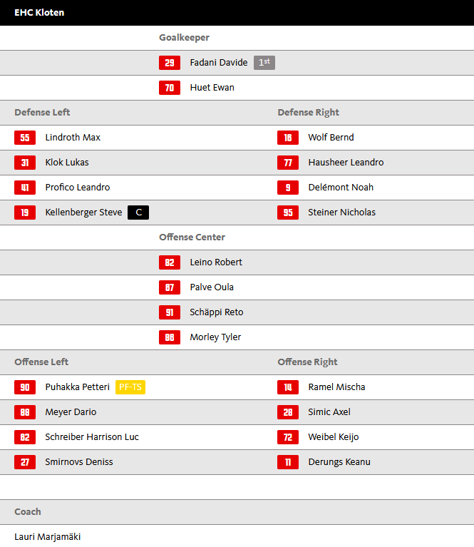Im Vergleich zur letzten Partie gegen Lausanne vollzieht Headcoach Marjamäki den Torhüterwechsel, anstelle von Huet hütet am heutigen Abend Fadani den Kasten. Morley wird anstelle von Backman in der vierten Linie als Center agieren, ansonsten bleibt alles gleich. Hier die Aufstellung der Flughafenstädter: