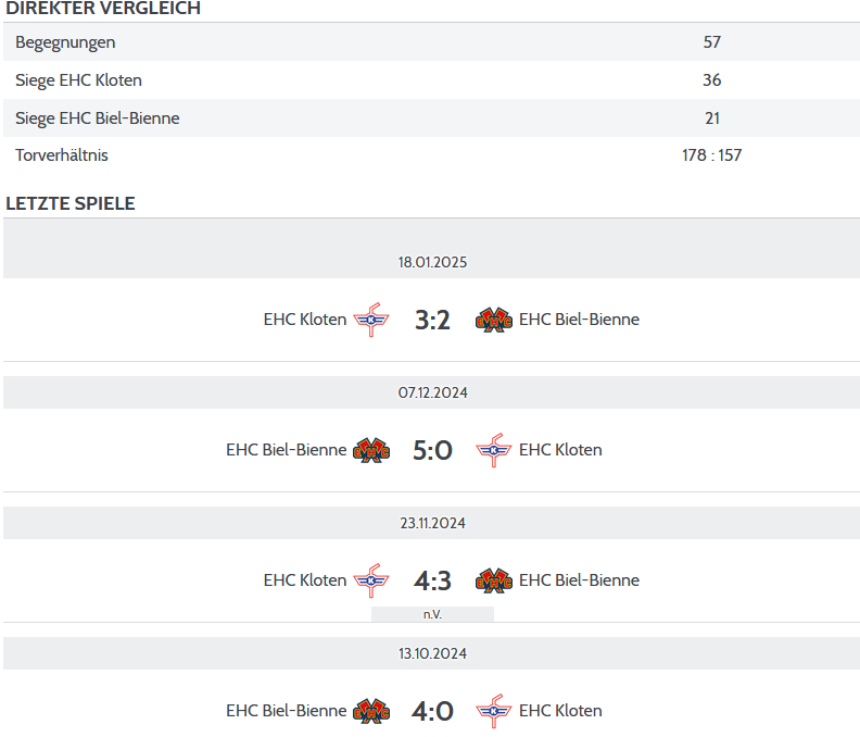 Die beiden Mannschaften trafen bereits 57 Mal aufeinander. Kloten konnte 36 Spiele gewinnen, 21 Partien entschied Biel für sich. Das Torverhältnis geht mit 178:157 erzielten Treffern zugunsten der Flughafenstädter aus. In der vergangenen Saison konnten sich beide Mannschaften je zwei Siege sichern.