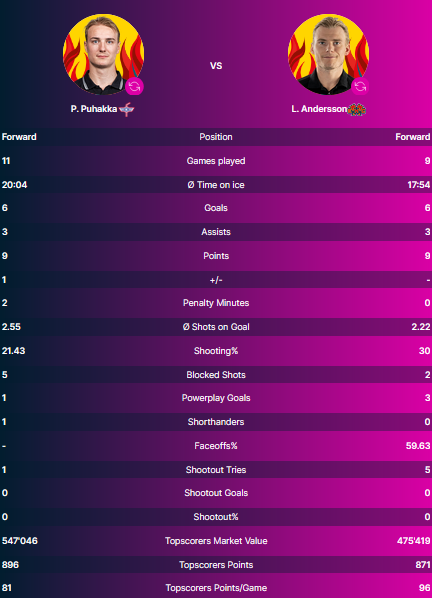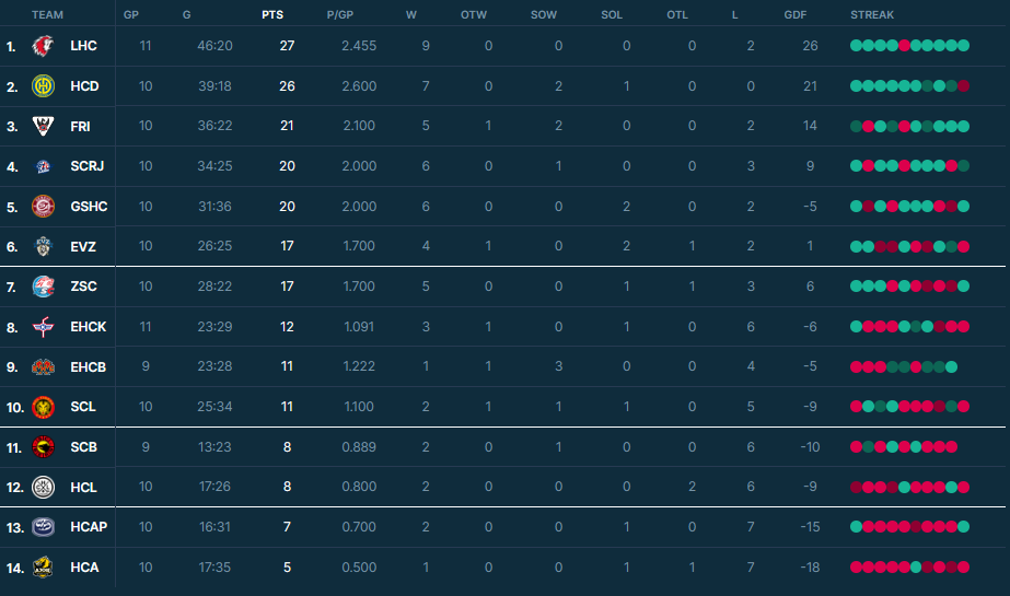Bei Kloten ist Petteri Puhakka Topscorer, er sicherte sich in elf Spielen neun Punkte (6 Tore / 3 Assists). Bei Biel trägt Lias Andersson den goldenen Held, er verbuchte in neun Spielen neun Punkte auf sein Scorerkonto (6 Tore / 3 Assists).