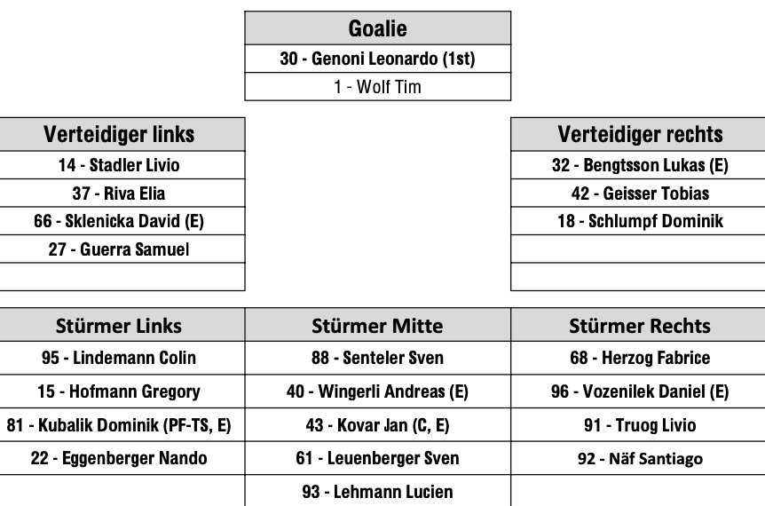 Wie gestern steht Leonardo Genoni zwischen den Pfosten. Tomas Tatar und Dorian Moret sind überzählig. Verletzt fehlen Raphael Diaz, Lino Martschini, Mike Künzle und Nic Balestra.
