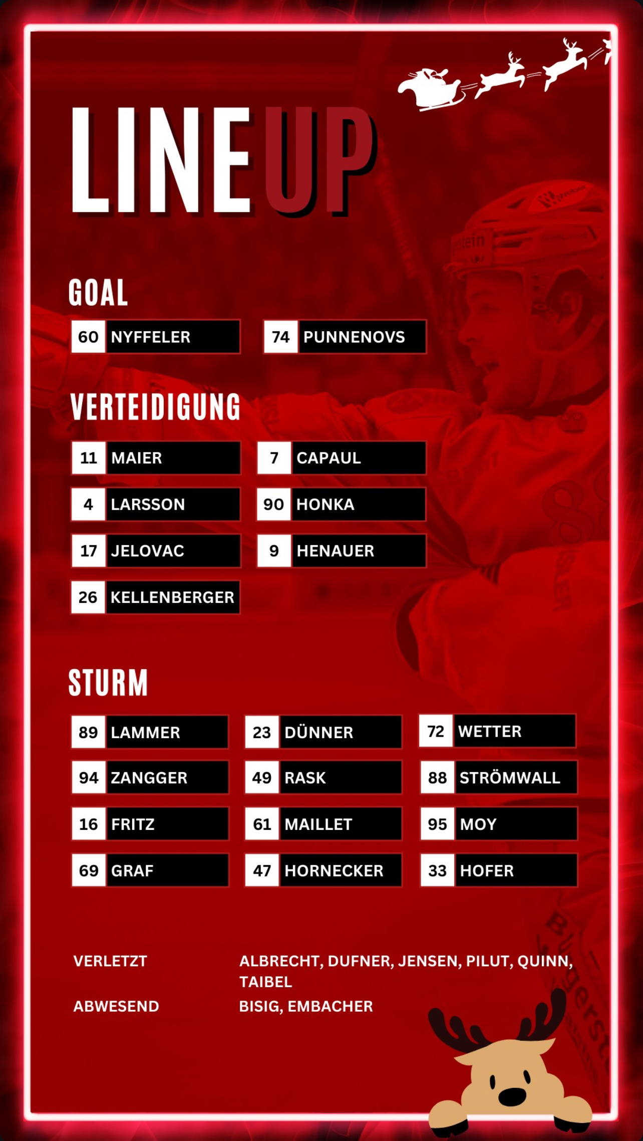 Im Vergleich zu gestern hütet heute Melvin Nyffeler den Kasten. Verletzt fehlen Lawrence Pilut, Mauro Dufner, Yannick-Lennart Albrecht, Jonas Taibel, Benjamin Quinn und Nicklas Jensen.
