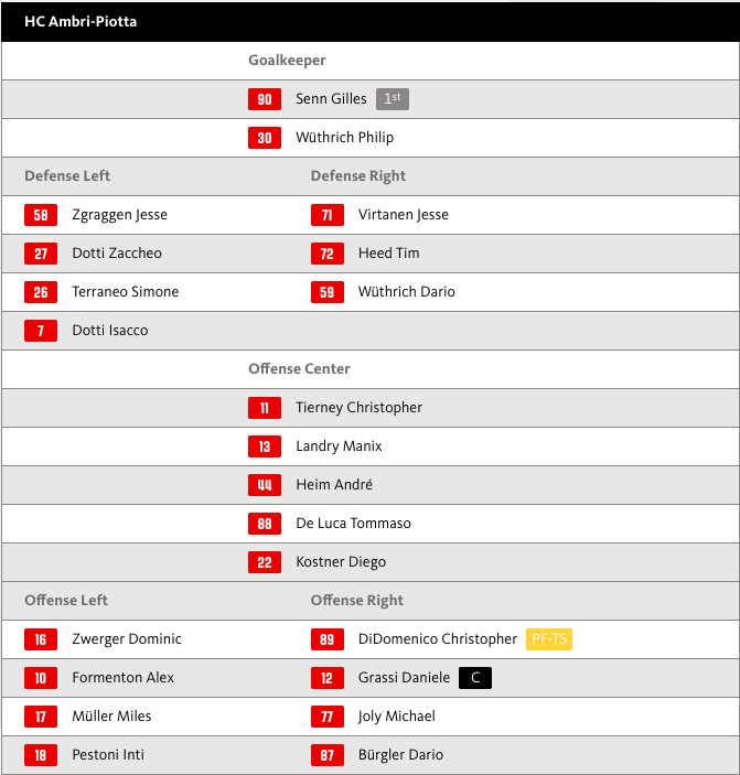 Heute steht Gilles Senn zwischen den Pfosten. Im Vergleich zum Spiel vom Samstag in Lausanne fehlen Michal Cajkovsky und Lukas Landry. An ihrer Stelle kommen Isacco Dotti und Alex Formenton zum Zug.