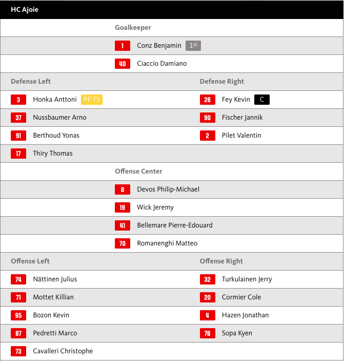 Benjamin Conz hütet das Tor der Ajoulot. Greg Ireland wirbelt im Vergleich zum gestrigen Spiel in Lugano seine Linien um – das Personal ist dasselbe.
