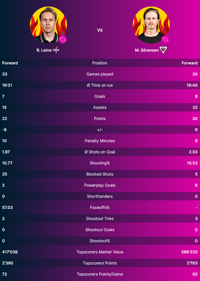 Auf Seiten des Heimteams trägt Robert Leino den Flammenhelm. Der Center kommt auf 22 Punkte, 7 Tore und 15 Assists. Bei Fribourg ist Marcus Sörensen der produktivste Spieler. Der Schwede steht bei 30 Punkten, 8 Tore und 22 Assists, und ist der offensive Fixpunkt der Drachen.