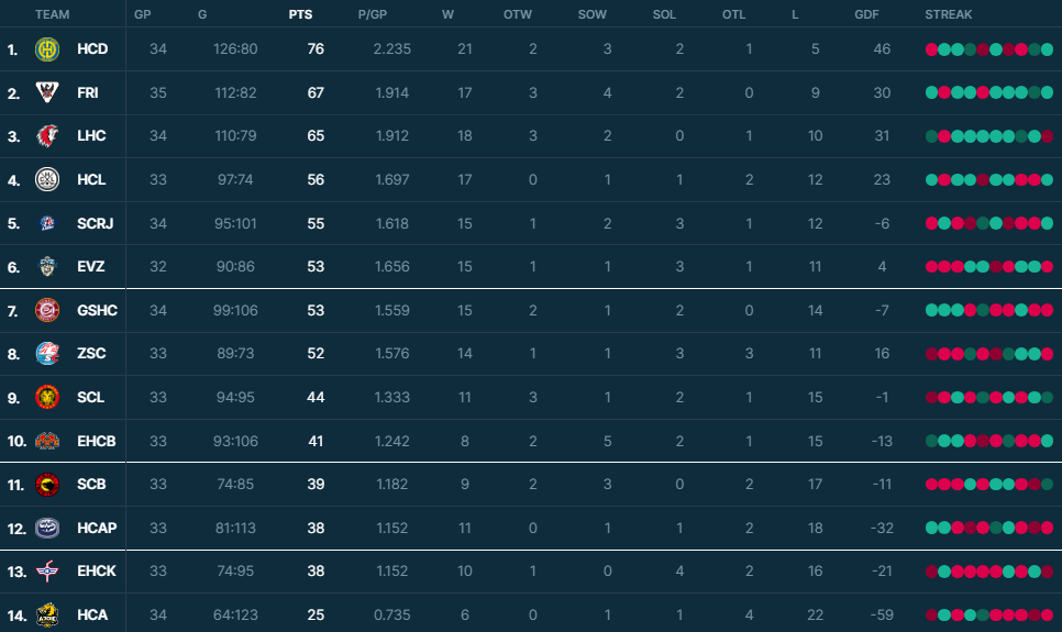 Die Davoser führen aktuell mit 76 Punkten die Tabelle an. Der grosse Vorsprung auf Fribourg und Lausanne ist inzwischen zwar etwas geschmolzen, aber nach wie vor mit neun Zählern komfortabel. Die gute Form der Konkurrenz mit jeweils lediglich zwei Niederlagen in den letzten zehn Spielen sowie eine Schwächephase der Davoser haben dies möglich gemacht. Ausserdem haben die Drachen aus Freiburg bereits eine Partie mehr gespielt. Die Innerschweizer aus Zug haben aktuell grössere Sorgen. Man liegt zwar noch auf Platz sechs, aber mit lediglich vier Siegen aus den letzten zehn Spielen ist man nach den beiden Tabellenletzten Ajoie und Kloten das formschwächste Team der Liga. Ausserdem hat man die Genfer punktgleich auf Platz sieben im Nacken, wenngleich man mit 32 Spielen zwei weniger hat als der direkte Konkurrent. Kann Davos die schlechte Form des Gegners heute ausnutzen? Oder sichert sich Zug wichtige Punkte im Kampf um die Top-6?