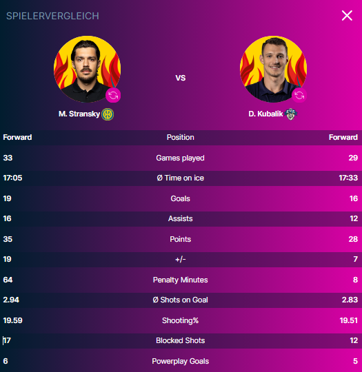 Beim EV Zug trägt Dominik Kubalík den gelben Helm. Der Tscheche hat bisher 16 Tore erzielt und 12 Assists geliefert. Beim HC Davos ist sein Landsmann Matěj Stránský der beste Punktesammler. Der Topscorer der Liga hat momentan 19 Tore und 26 Assists auf dem Konto.